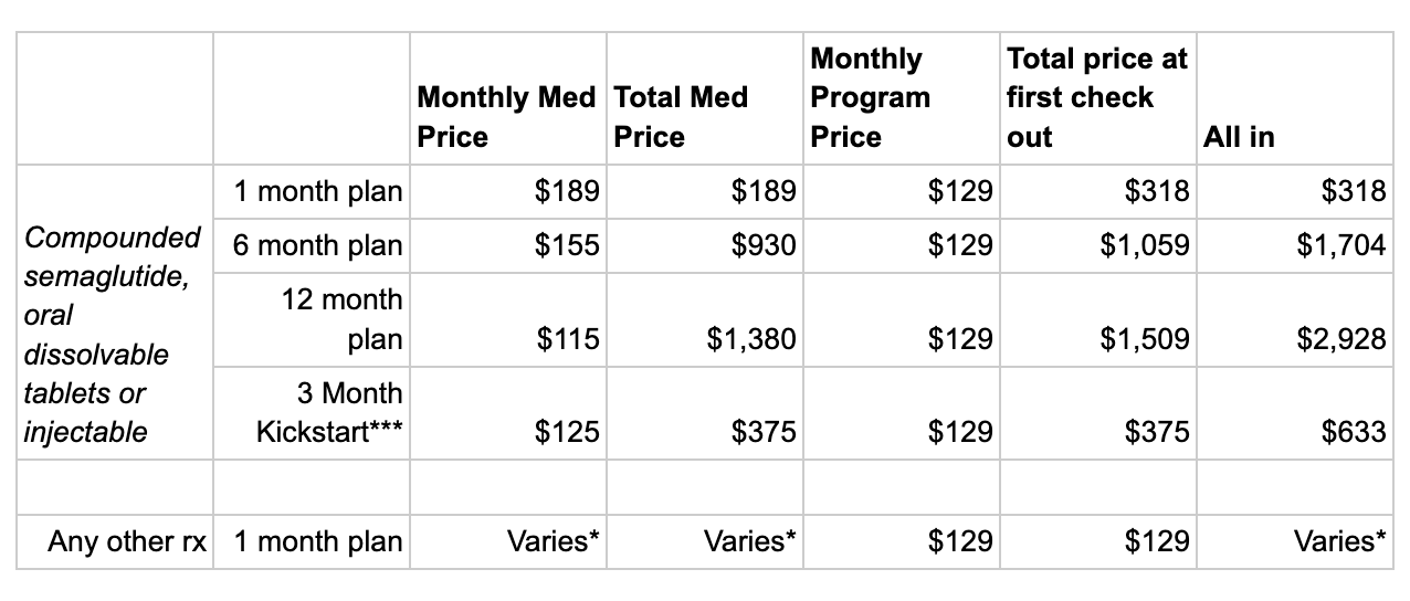 - After any month-to-month or multi-month program plan ends, your medication charge for compounded semaglutide will automatically renew, pending a valid prescription, at the month-to-month rate of $189/month unless you update or cancel before renewal.